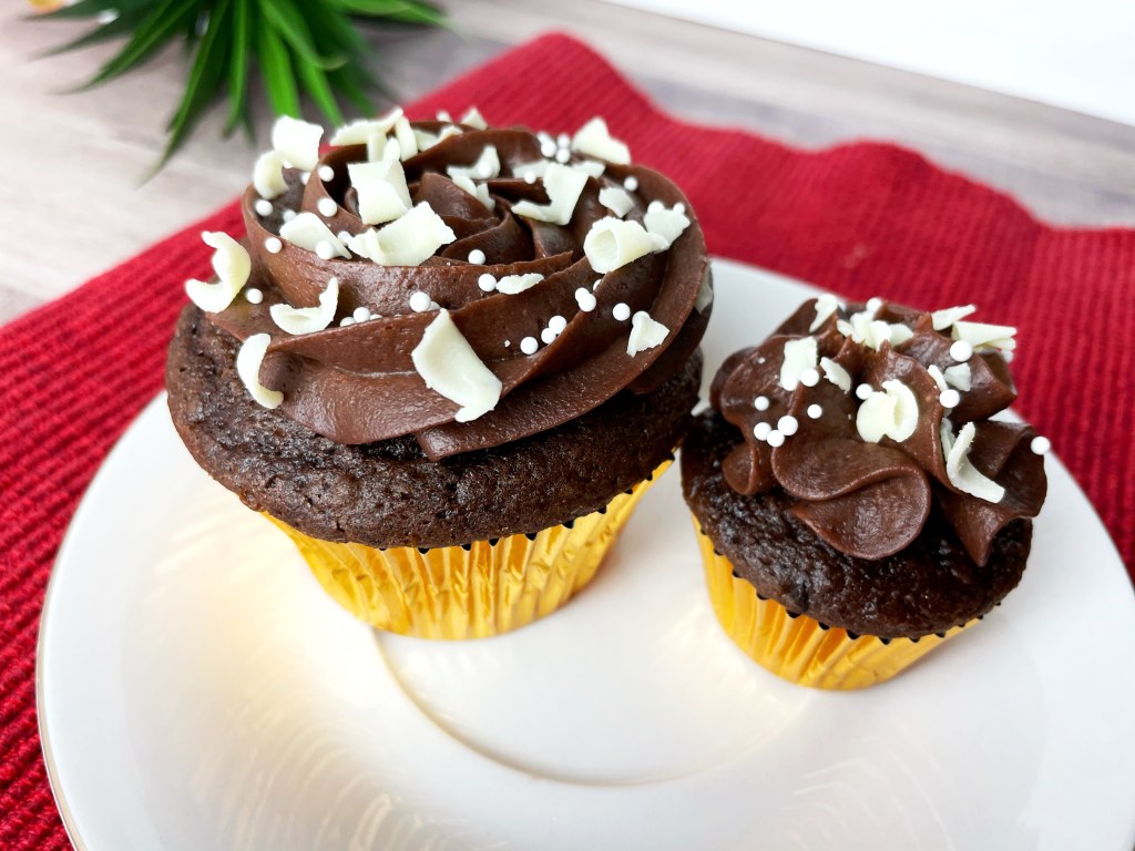 Chocolate cupcake with chocolate whipped cream frosting topped with white chocolate curls and sprinkles (Available in regular and mini size)